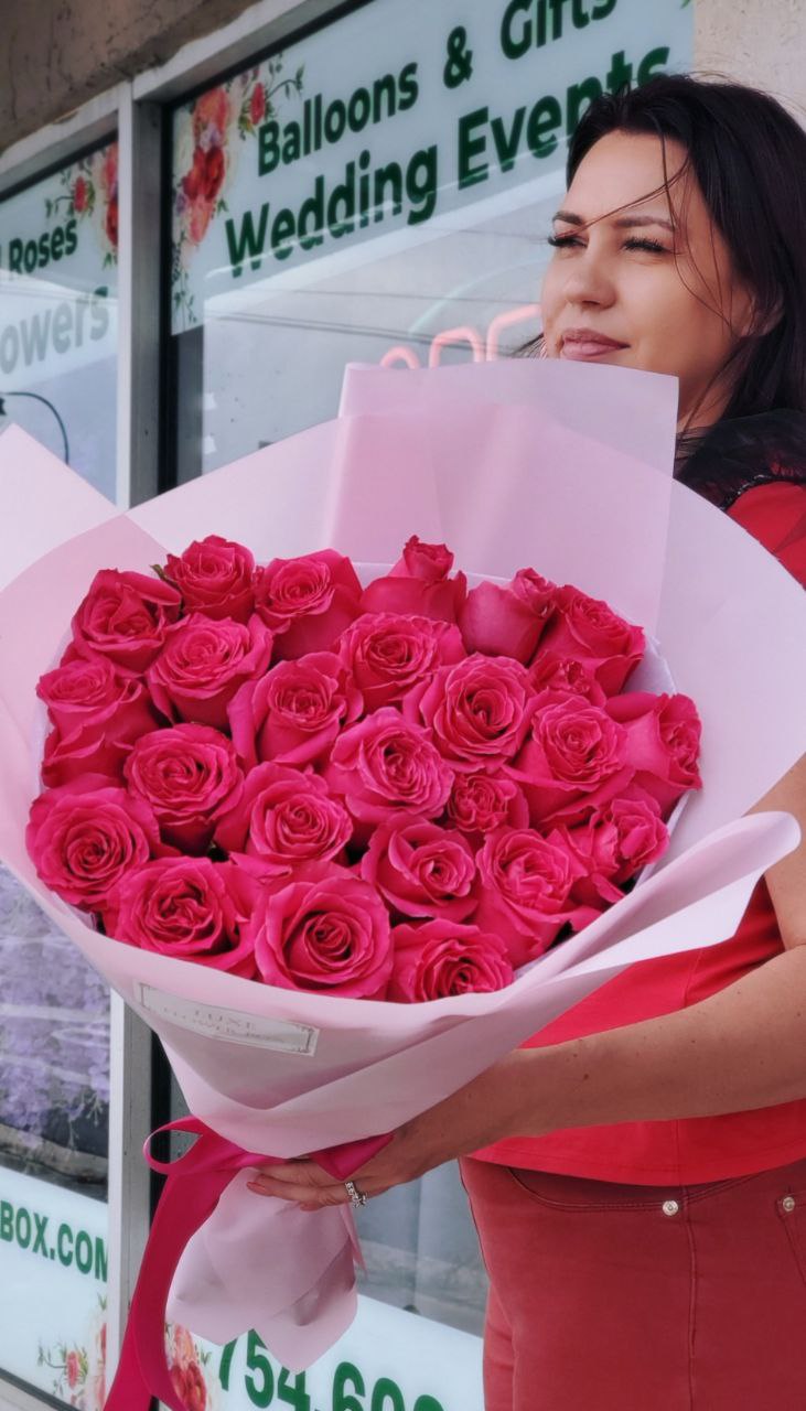 A hand-tied bouquet of hot pink roses is a classic choice for many occasions. Here are some additional details about this type of bouquet that you may find interesting: