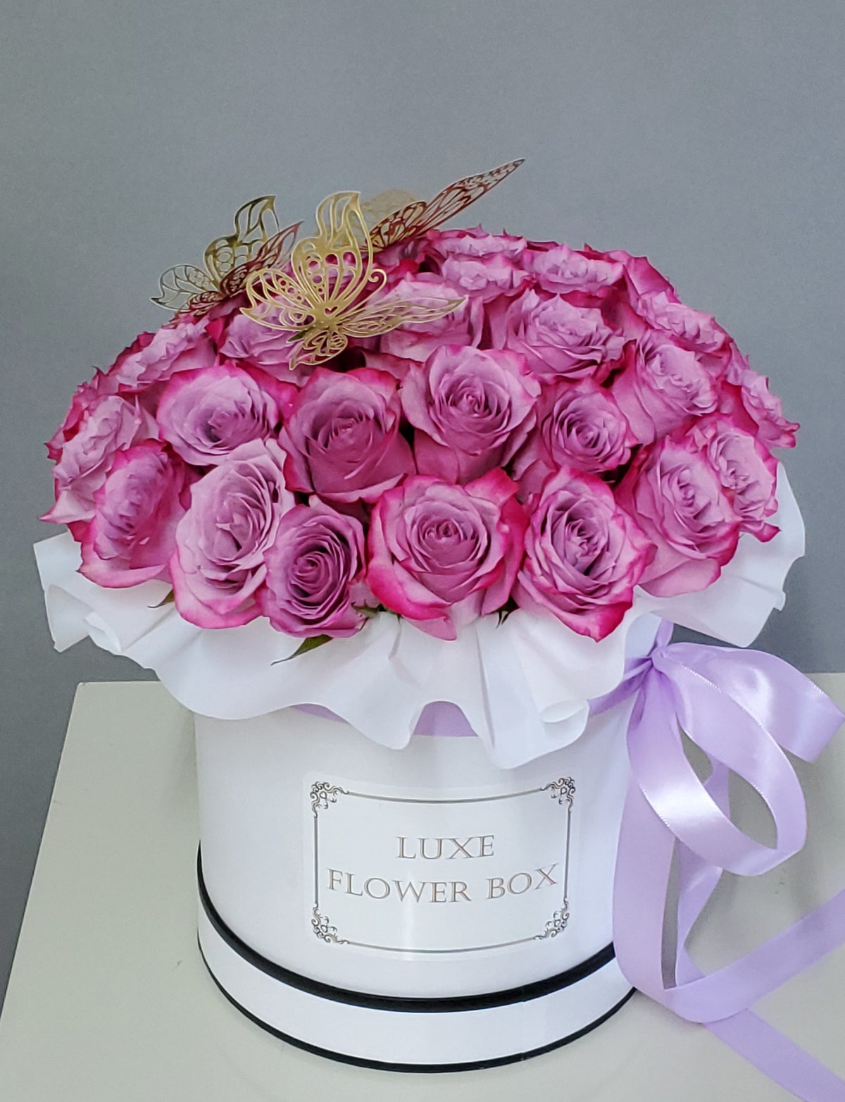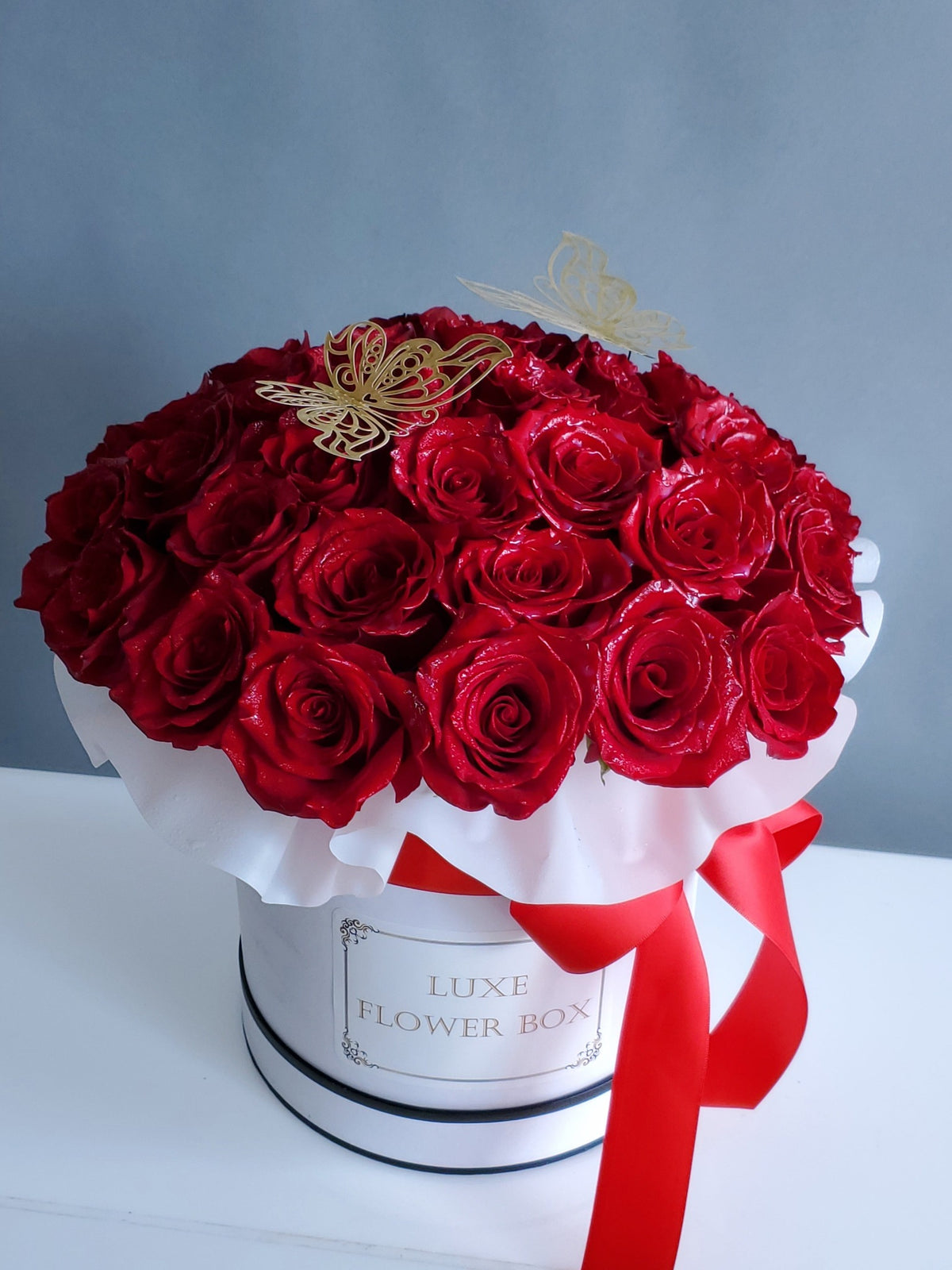 Este elegante arreglo contiene de 26 a 30 rosas frescas de lujo en caja redonda
